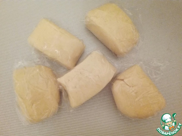 4. Разделите тесто на 5 равных частей и замотайте их в пищевую плёнку. Отправьте в морозильную камеру.