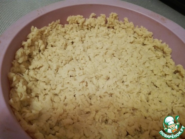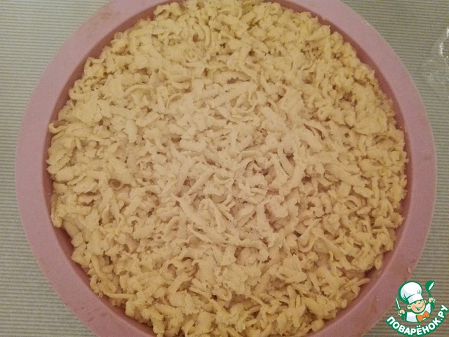 8. Натрите 3 подмёрзших кусочка теста на крупной тёрке. Уложите в форму, сформировав бортики.