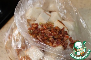Батон (лучше вчерашний) нарезать крупными кубиками и сложить его в пакет.