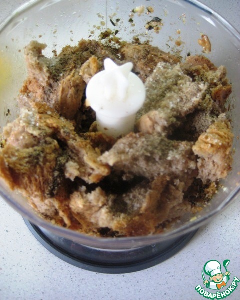 Добавить к измельченной ореховой смеси отжатый батон, соль и перец по вкусу. Снова все измельчить блендером в однородную массу.