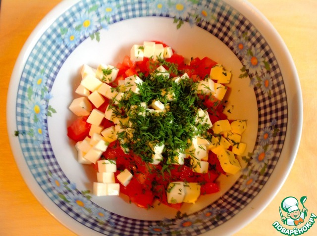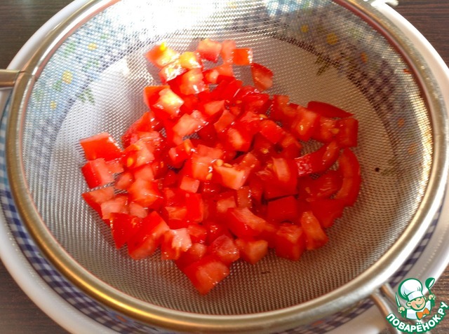 Помидор помыть, семена удалить и нарезать мелкими кубиками. Поместить на сито для удаления лишней влаги.