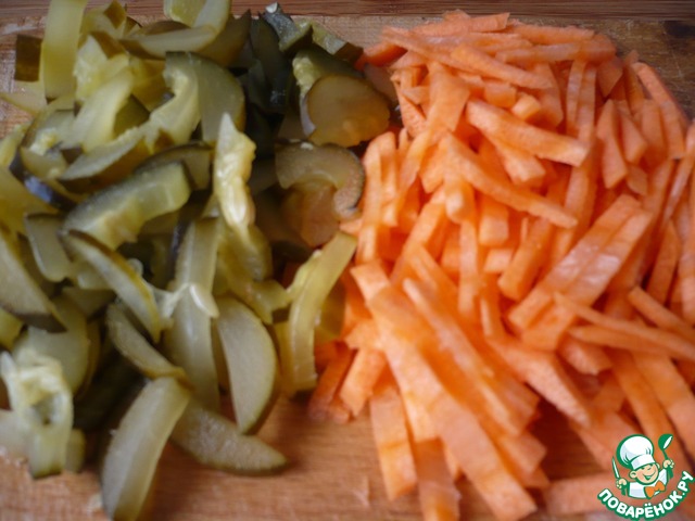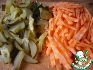 Морковь нарезать соломкой, соленый огурец нарезать произвольно.