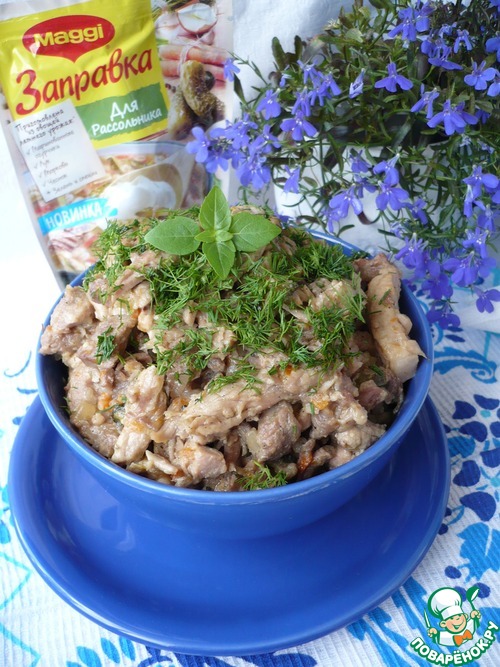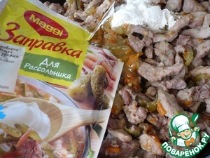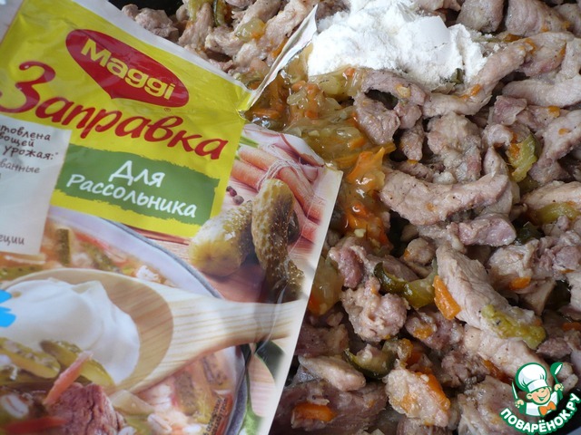 За 5 минут до готовности добавляем муку и заправку для рассольника MAGGI, все перемешать.