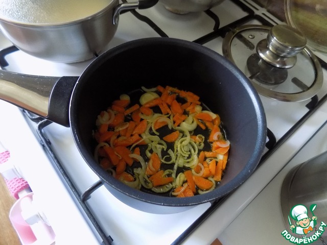 В сотейник наливаем масло и разогреваем его. Выкладываем лук. Золотим его и через минуту-морковь. Можно обжарить, я делаю на маленьком огне и под крышкой, а значит больше томлю. Потомила минут 5.