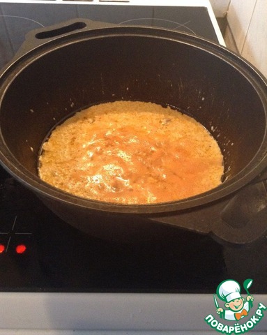 Перекладываем мясо в казан (если нет казана - можно в сковороде с толстым дном). Добавляем майонез, кетчуп и воду, чтобы покрывало мясо полностью и тушим около часа.