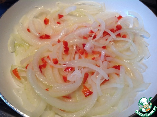 Приготовить соус. Лук нарезать тонкими тонкими полукольцами. Обжарить в 1 ст. л. разогретом на сковороде кукурузном масле. Добавить измельчённый острый перец. Жарить 5 минут.