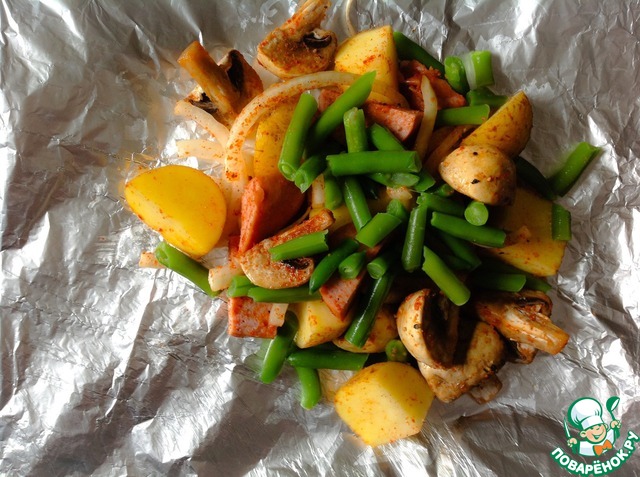 Разделить колбаски, картофель, зеленую фасоль, грибы и лук на 4 равные части и поместить в центр каждого квадрата фольги в один слой. -