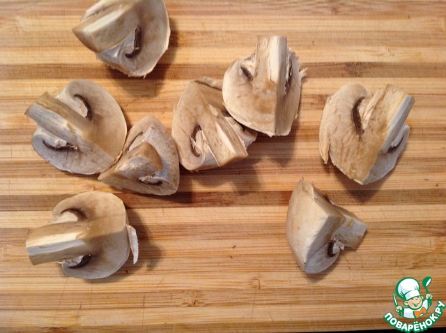 Грибы обтереть салфеткой, разрезать на 4 части.