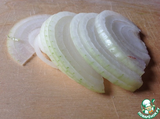 Репчатый лук очистить, нарезать тонкими полукольцами.
