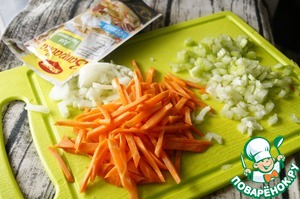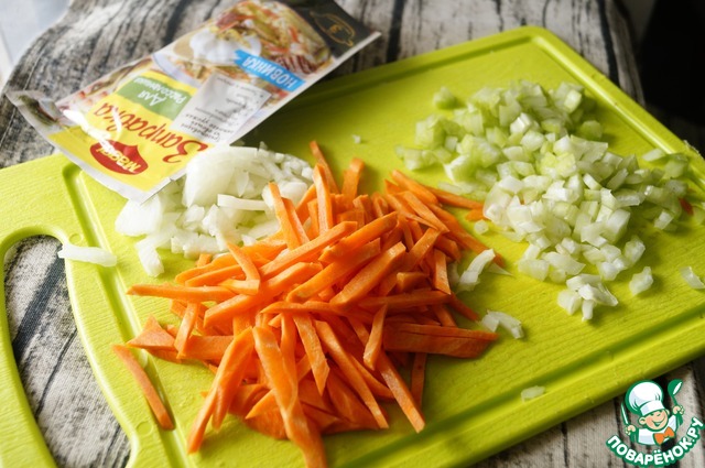 Морковь вымыть и очистить, нарезать тонкой соломкой. Лук очистить, сполоснуть и мелко порубить. Сельдерей вымыть и нарезать не крупным кубиком.