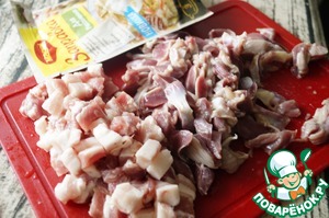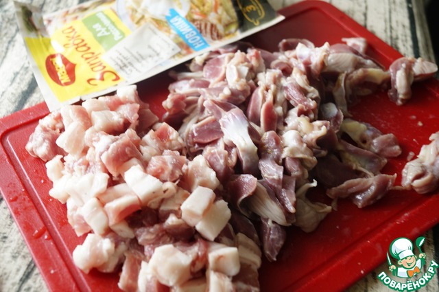 Свинину нарезать небольшим кубиком. Куриные желудки зачистить от пленок и жира. Нарезать их соломкой.