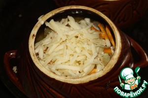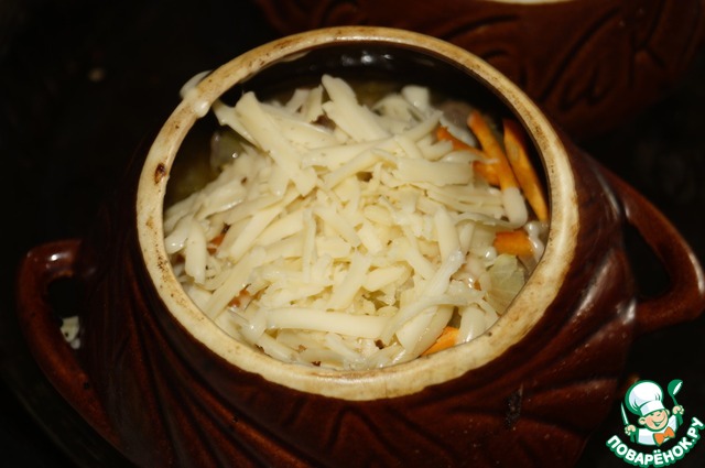 Вынуть горшочки из духовки, снять крышки и посыпать тертым сыром (крышками) не закрывать. Снова поставить в духовку минут на 5-10, чтобы сыр расплавился и немного зарумянился.
