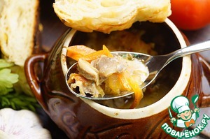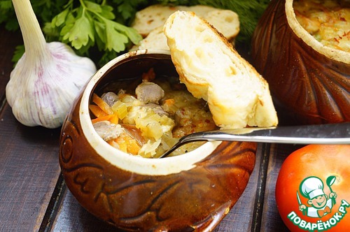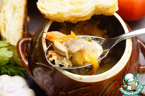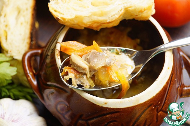 В горшочки для запекания слоями выложить сначала свинину и желудочки, затем слой овощей, мясо и желудочки и снова овощи. На 2/3 горшочка влить бульон, не покрывая полностью жидкостью его содержимое. Поставить их в разогретую до 180 градусов, духовку. Готовить 1 час.