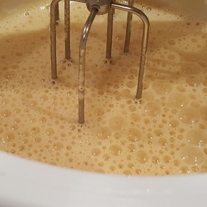 Добавить кефир, взбить буквально пол минуты на первой скорости миксера и добавить соду, взбить еще секунд 10 для равномерного распределения соды.