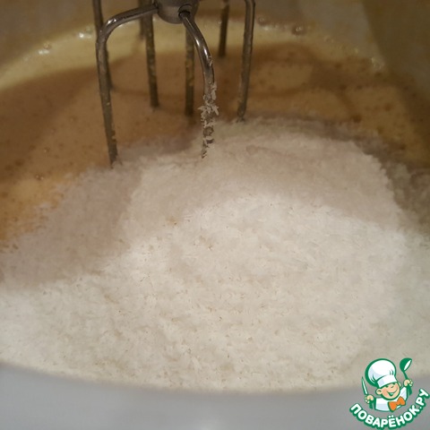 Добавить кокосовую стружку. Взбить и добавить пшеничную муку. Взбить до однородности.