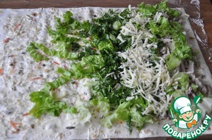 Берём варёное куриное филе и отварную постную свинину, режем произвольными тонкими полосками или кубиками, кладём на намазанный лист лаваша с краю. |
