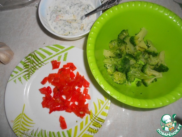Брокколи отварить в течение 3-4 мин в слегка подсоленной воде. Сладкий перец нарезать квадратиками.