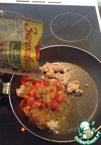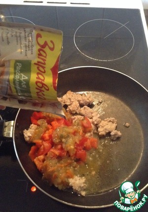 Фарш обжариваем, добавляем порезанный помидор, болгарский перец и заправку магги для рассольника. Тушим до готовности.