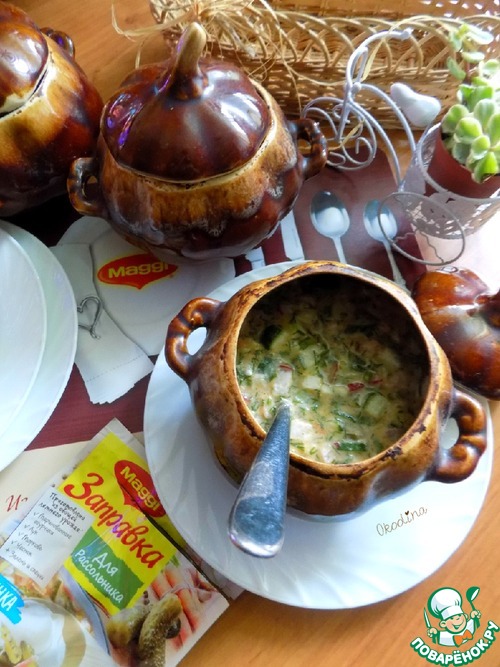 Окрошка на хлебном квасе с консервированной рубленной форелью и для пикантности, заправленная заправкой для рассольника от Maggi. Очень вкусная окрошка!!!