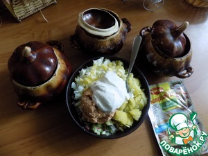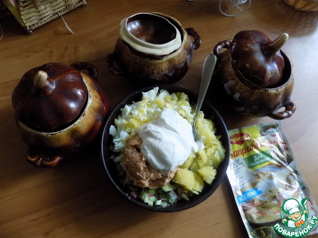 Так же люблю окрошку настаивать и делать в глиняной посуде. Я взяла 3 порционных горшка. Выложила всё в горшочки, разделив поровну и залила квасом. Попробовала на соль. Досолила по вкусу и положила сахар тоже по вкусу. Перемешала, накрыла крышками и отправила в холодильник. Настояться нужно дать окрошке хотя бы минут 30, а лучше-часа два!