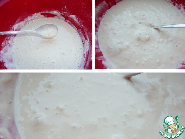 И замесить тесто, как на оладьи. Миску с опарой накрыть пленкой или крышкой и поставить в теплое место, где нет сквозняков, на 30 минут. За это время дрожжи начнут «работать», и получится такая пышная «шапка». Позже шапка станет опадать, и появятся пузырьки. Это значит, что опара созрела.