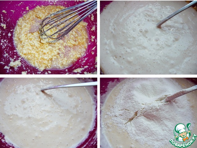Добавить опару, перемешать, частями вводить просеянную муку.