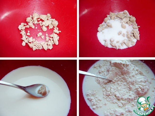 Я сделала тесто опарным способом. Раскрошить дрожжи, добавить сахар, влить теплое молоко, всыпать муку.