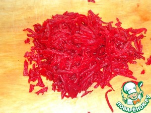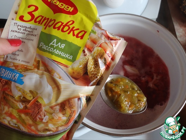 За 15 минут до готовности мяса можно добавить картофель и свеклу, минут через 5 - хлопья, за 5 минут до готовности - заправку Магги для "Рассольника".