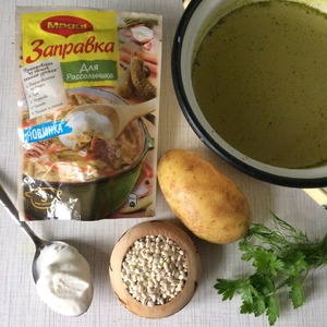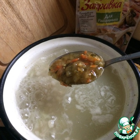 В готовый суп добавить 2 ст. л. приправы Магги "Заправка для рассольника". довести до кипения и снять с огня.