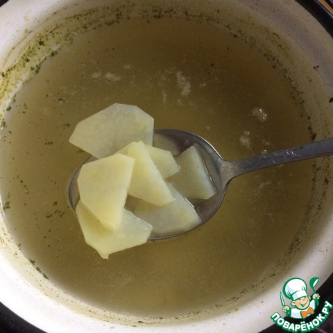 В куриный или мясной бульон добавить картофель, нарезанный дольками и отварить. Затем добавить к картофелю сваренную перловую крупу.