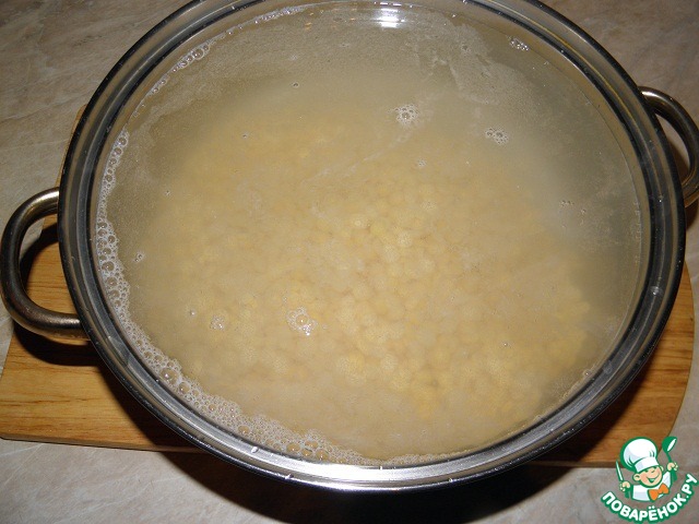 Сначала как обычно варим горох, я люблю, чтоб он разварился в пюре, поэтому всегда замачиваю в холодной воде, даже для Мистраль исключения не делаю ( он вообще всегда в пюре сразу превращается) Варим приблизительно в районе 40-60 минут, зависит от вашего гороха