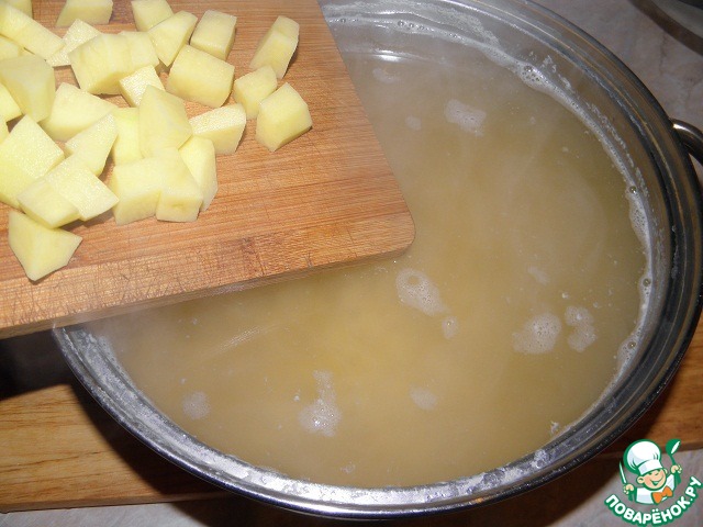 Отправляем картофель в суп (минут на 10-15), картофель мы тоже любим хорошо разваренный