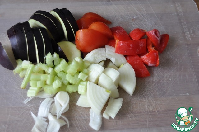 • Берём баклажан, болгарский перец, помидор, сельдерей, лук, чеснок, моем, режем всё крупными кусками.