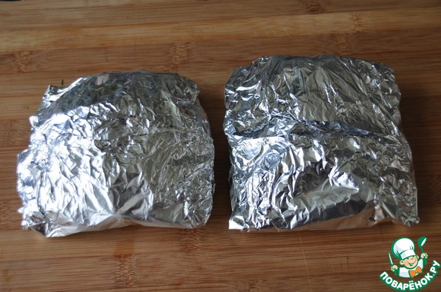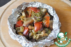 • Для порционной подачи отрываем соответствующее числу едоков количество листов фольги, сворачиваем пополам. На каждый свёрнутый лист фольги кладём овощи, с расчётом на одну порцию.