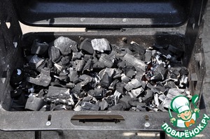 • Разжигаем мангал. Когда угли прогорят, кладём конверты с овощами в угли, запекаем 15 минут.