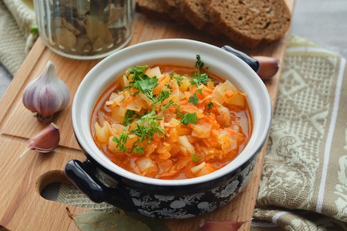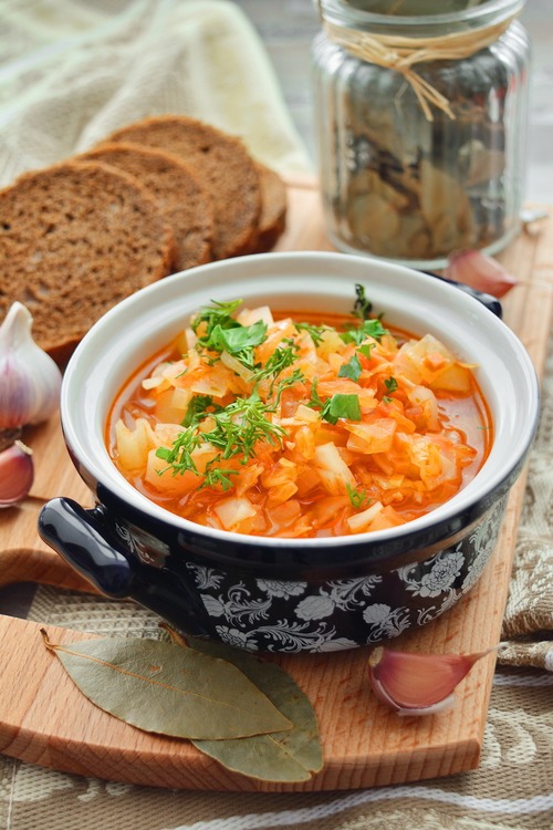 Добавить обжарку, лавровый лист и варить еще 10-15 мин. Снять с огня, тут же заправить толченым чесноком, вытащить лавровый лист и укутать щи на полчаса.