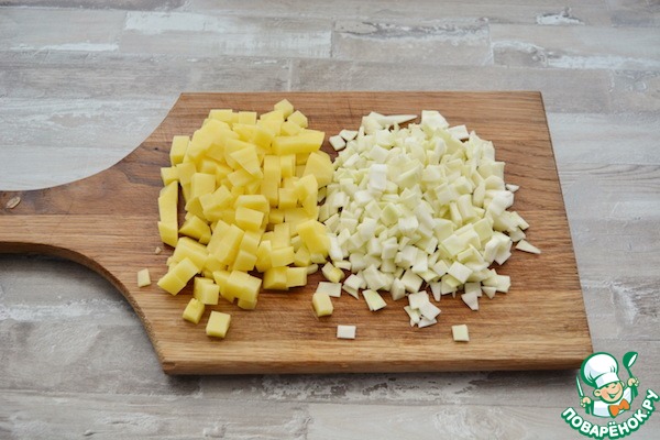 Морковь и лук нарезать мелкими кубиками, обжарить на растительном масле.