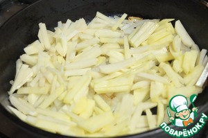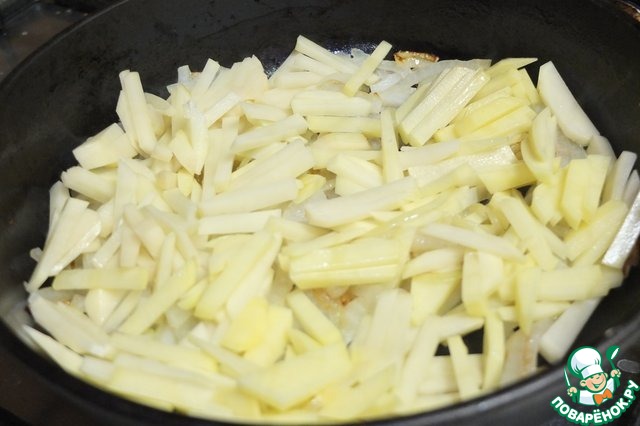 Картофель нарезаем тонкой соломкой и добавляем к луку.