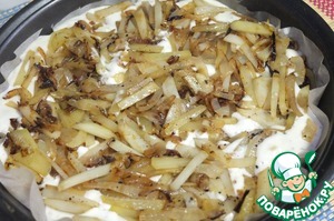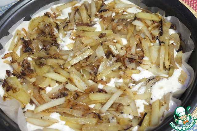 Дно формы диаметром 24 см застилаем пекарской бумагой и выливаем половину теста. Сверху выкладываем картофельно-луковую начинку.