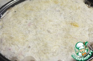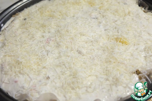 Выливаем вторую часть теста и посыпаем тертым сыром.