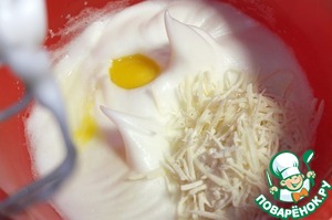 В взбитые белки добавляем сначала один желток и половину сыра с мукой. Взбиваем на самой маленькой скорости