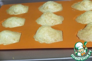 Затем второй желток и оставшийся сыр с мукой. Тесто готово. Можно выложить его на противень ложкой. Но мне попалась на глаза формочка для мадленок и я воспользовалась ей. У меня аккурат получилось 9 печенек.