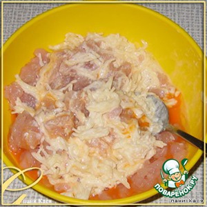 Добавляем размятую вилкой лапшу (вместо хлеба, это нежнее...), яичко и соль.