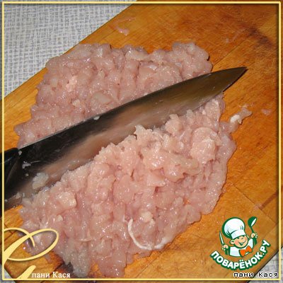 Kуриное филе режем на мелкие кусочки, рубим острым ножом до состояния фарша.