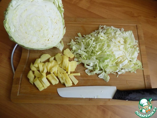 У меня был сваренный бульон из постной свинины. Процедила его, поставила на огонь, довела до кипения и выложила сразу капусту и картофель порезанные.