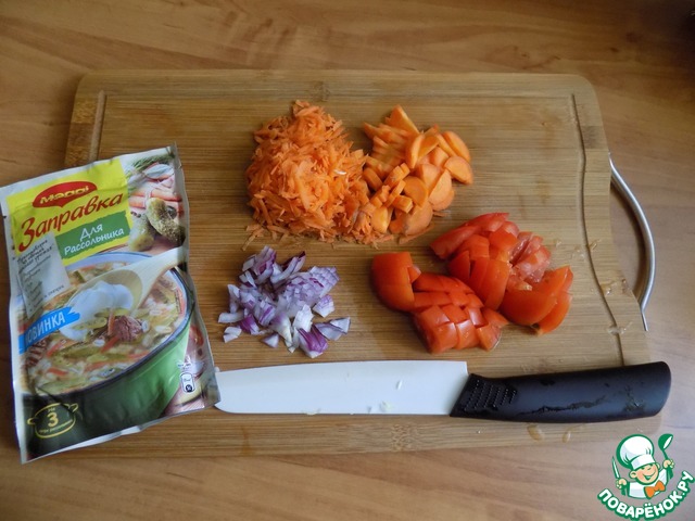 Параллельно порезала одну морковь, другую-натёрла на тёрке. Лук порезала мелко и помидор-кубиком.