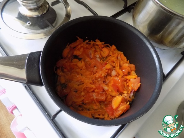 В сотейник налила масла и выложила лук с морковью, потомила и добавила помидор. Под крышкой томила 10 минут.