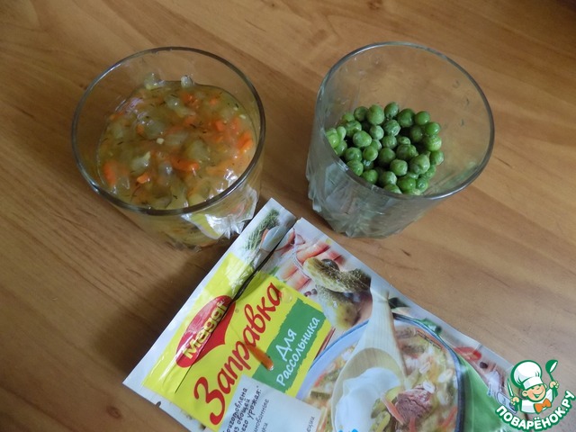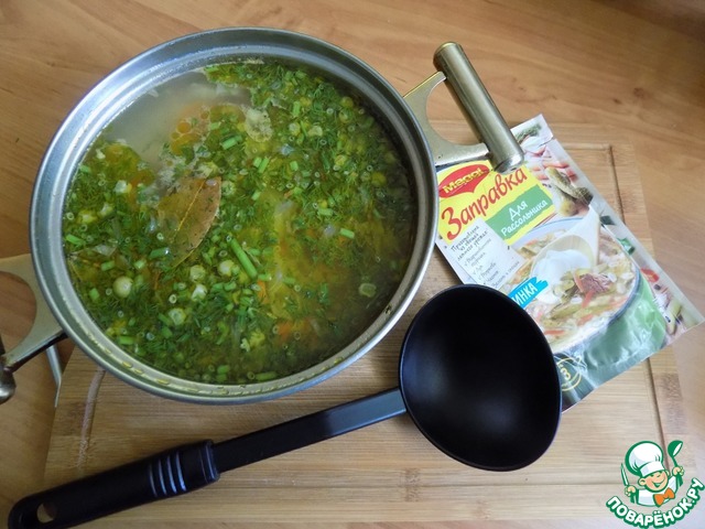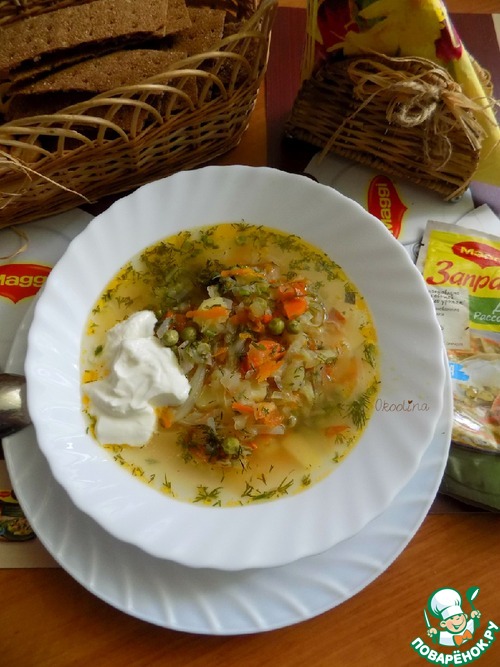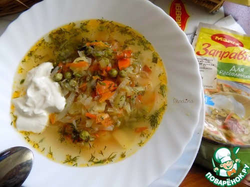 Когда капуста с картофелем поварилась 10-12 минут, выложила содержимое сотейника и зелёный горошек. Не солила. Варила ещё 10 минут. Затем выложила заправку для рассольника. Поварила ещё минут 5. За минуту до конца готовки положила рубленный укроп и лавровый лист.