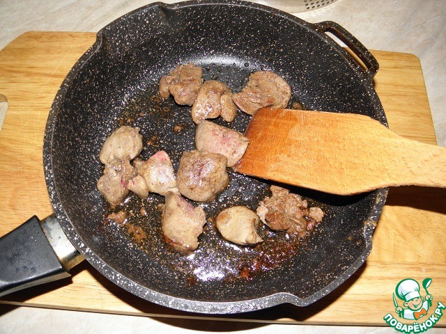 Печень промыть, очистить, разрезать на небольшие кусочки, обжарить на сливочном масле в течение 3-5 минут