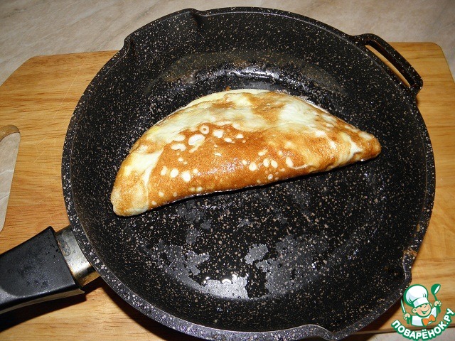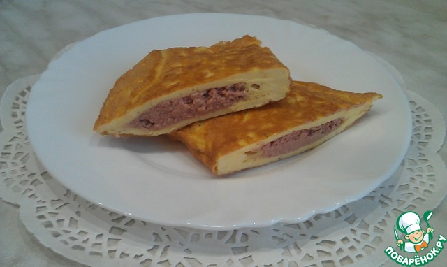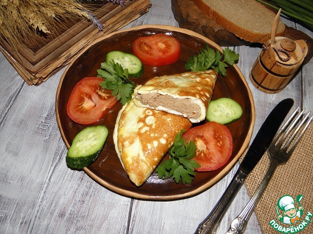 Когда омлет загустеет, выложить на одну его половину печеночную массу